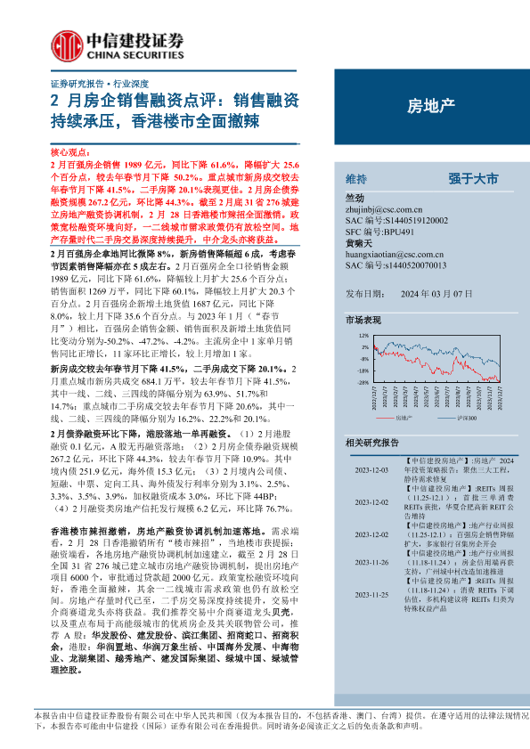 【中信建投证券】【20240307】房地产行业2月房企销售融资点评:销售融资持续承压,香港楼市全面撤辣-24页