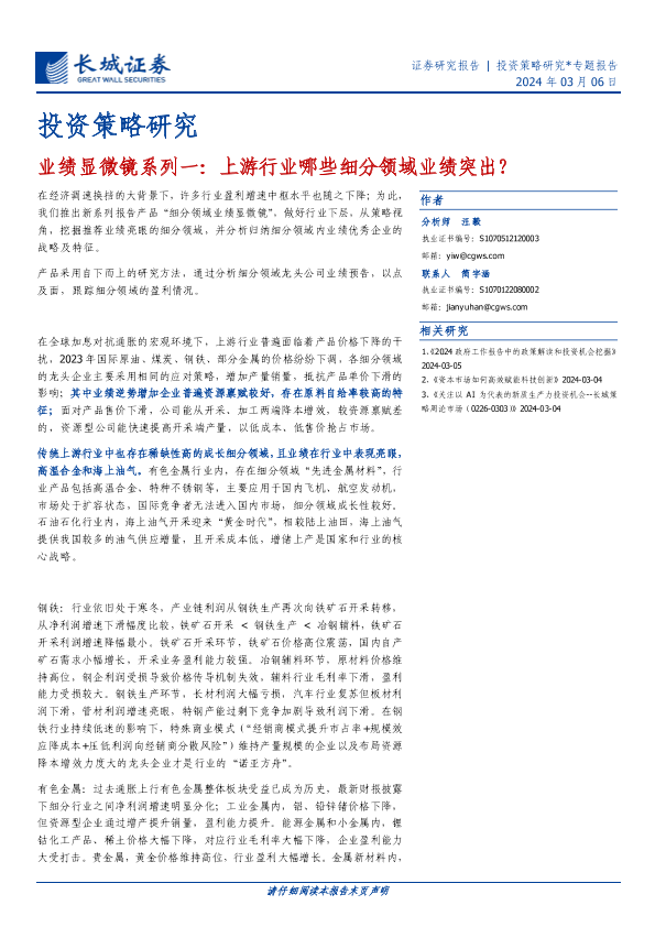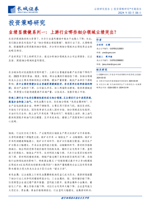 【长城证券】【20240306】投资策略研究-业绩显微镜系列一:上游行业哪些细分领域业绩突出?-15页