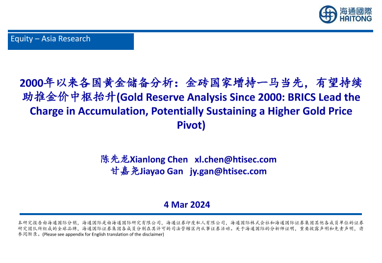【海通国际】【20240304】有色金属行业2000年以来各国黄金储备分析:金砖国家增持一马当先,有望持续助推金价中枢抬升-43页