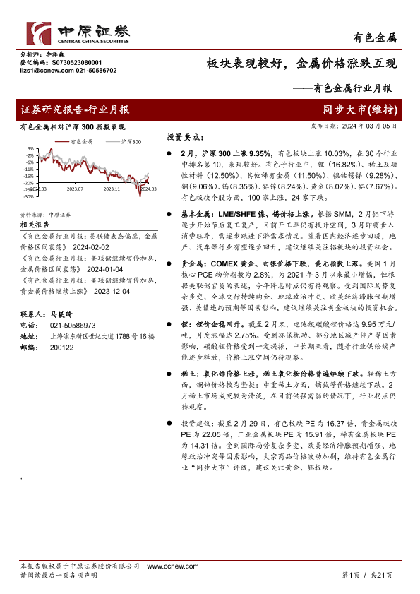 【中原证券】【20240305】有色金属行业月报:板块表现较好,金属价格涨跌互现-21页