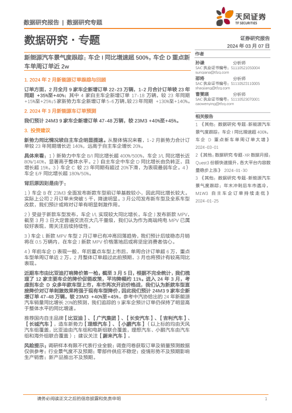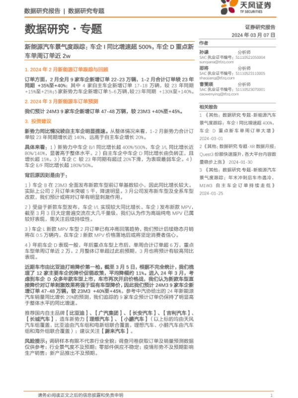 【天风证券】【20240307】汽车行业数据研究专题-新能源汽车景气度跟踪:车企I同比增速超500%,车企D重点新车单周订单近2w-11页