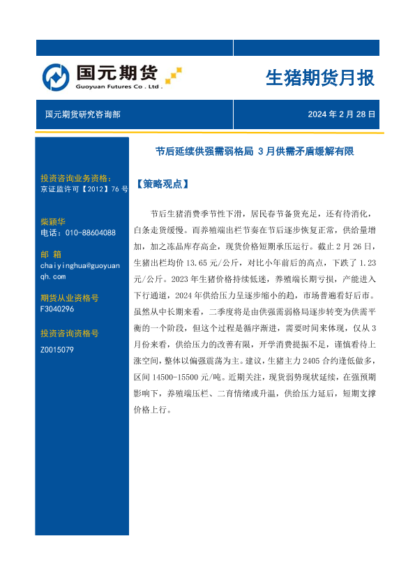 【国元期货】【20240228】生猪期货月报:节后延续供强需弱格局 3月供需矛盾缓解有限-14页