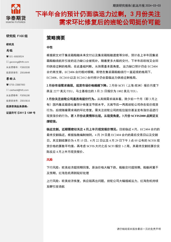 【华泰期货】【20240303】航运月报:下半年合约预计仍面临运力过剩,3月份关注需求环比修复后的班轮公司挺价可能-21页