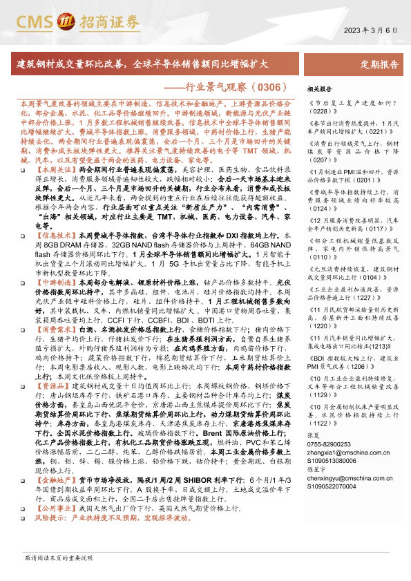 【海通证券】【20240306】行业景气观察:建筑钢材成交量环比改善,全球半导体销售额同比增幅扩大-33页
