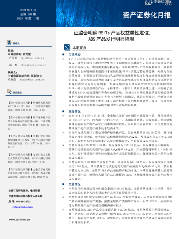 【中诚信国际】【20240306】资产证券化月报:证监会明确REITs产品权益属性定位,ABS产品发行明显降温-16页