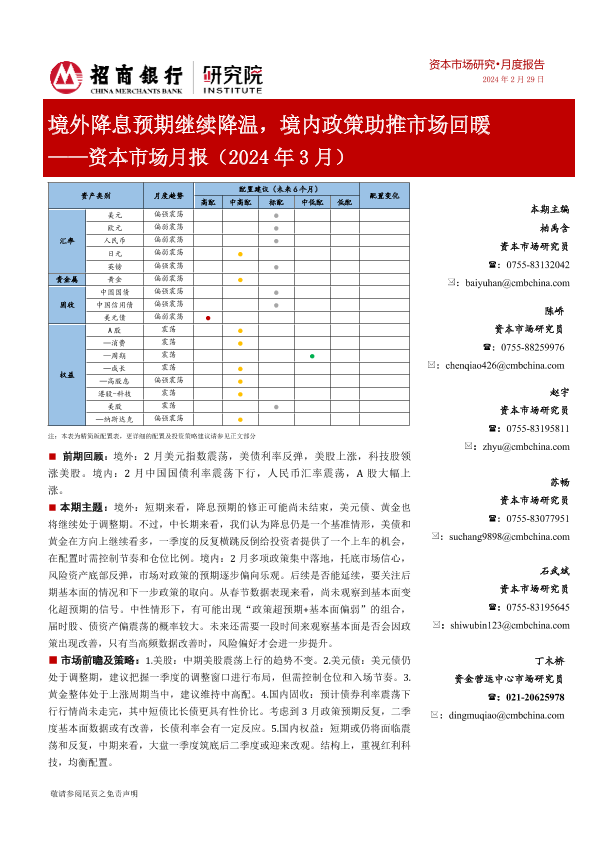 【招商银行】【20240229】资本市场月报(2024年3月):境外降息预期继续降温,境内政策助推市场回暖-25页