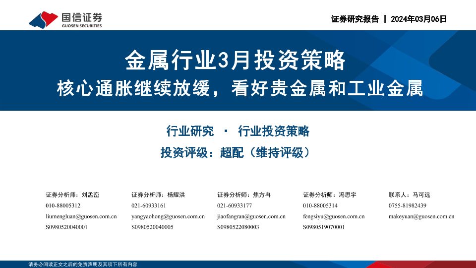 【国信证券】【20240306】金属行业3月投资策略:核心通胀继续放缓,看好贵金属和工业金属-46页
