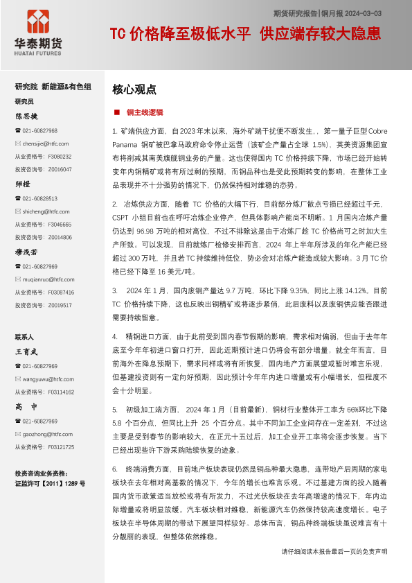 【华泰期货】【20240303】铜月报:TC价格降至极低水平 供应端存较大隐患-21页