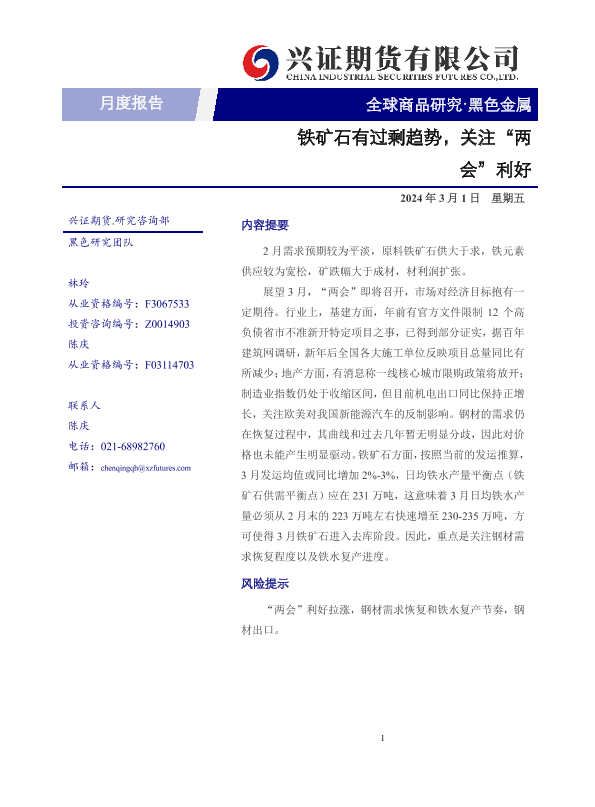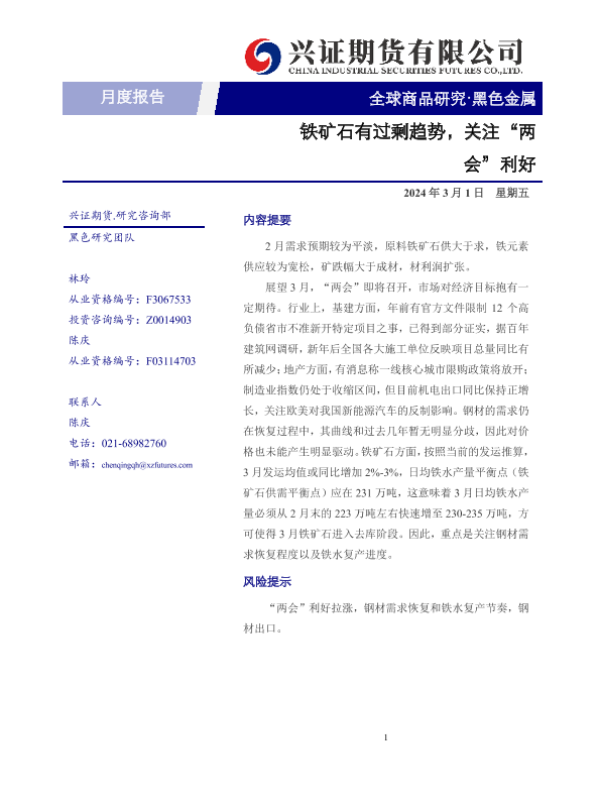 【兴证期货】【20240301】黑色金属月度报告:铁矿石有过剩趋势,关注“两会”利好-14页