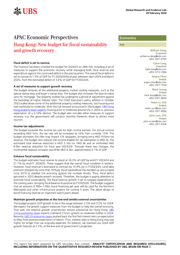 【UBS Securities Asia Limited】【20240229】香港2024/25财年新预算:财政可持续性与增长复苏-8页