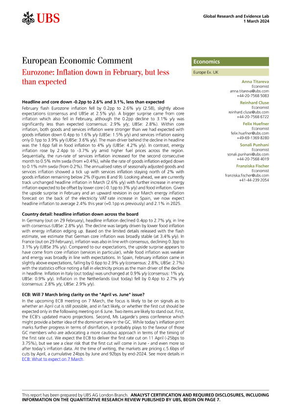 【UBS AG London Branch】【20240301】Eurozone Inflation down in February, but less than expected-8页