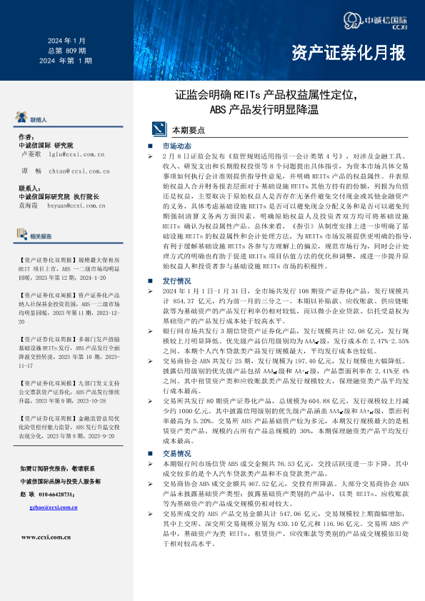 【中诚信国际】【20240101】【资产证券化月报】证监会明确REITs产品权益属性定位,ABS产品发行明显降温-18页