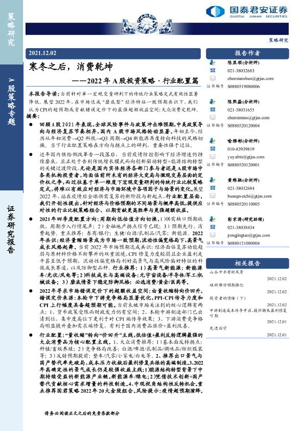【国泰君安证券】【20211202】2022年A股投资策略·行业配置篇:寒冬之后,消费乾坤-41页