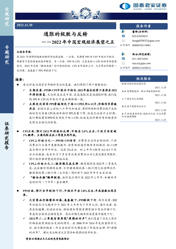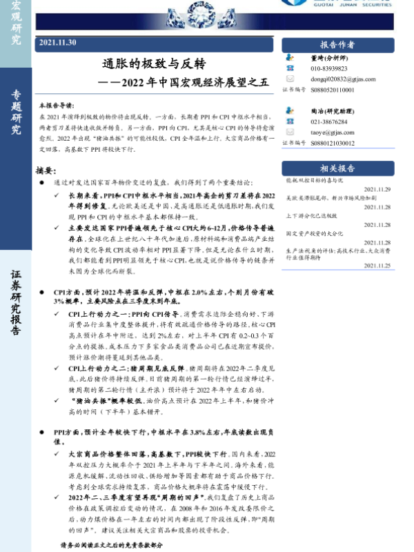 【国泰君安证券】【20211130】2022年中国宏观经济展望之五:通胀的极致与反转-16页