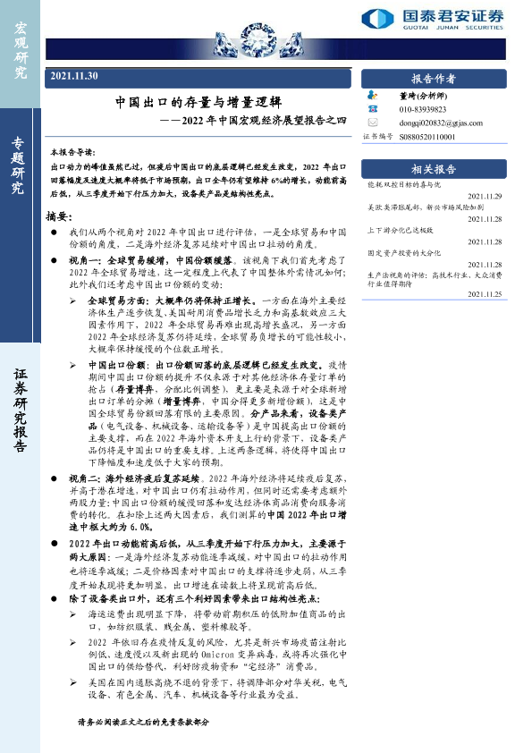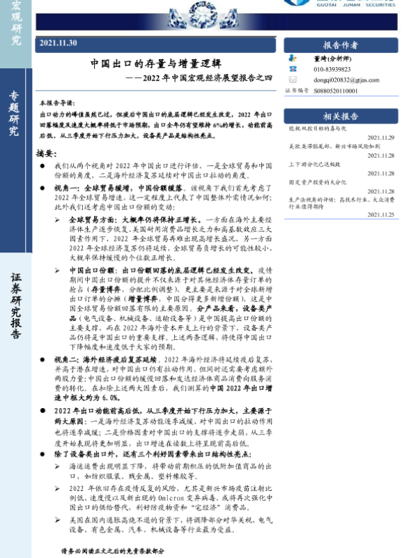 【国泰君安证券】【20211130】2022年中国宏观经济展望报告之四:中国出口的存量与增量逻辑-21页