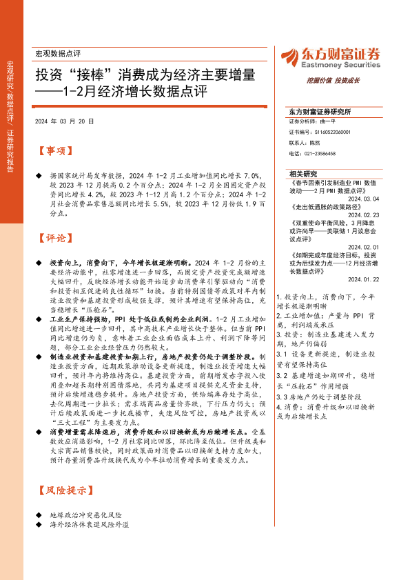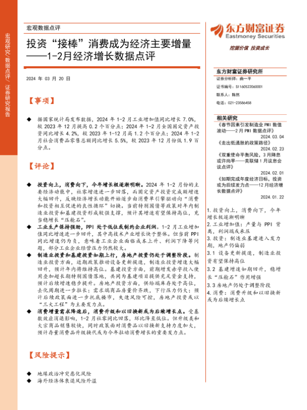 【东方财富证券】【20240320】1-2月经济增长数据点评:投资“接棒”消费成为经济主要增量-12页