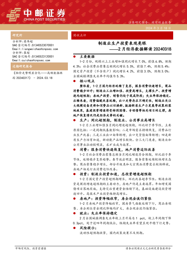 【中邮证券】【20240318】2月经济数据解读:制造业生产投资表现亮眼-14页
