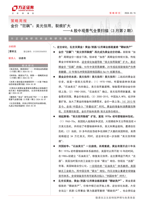 【方正证券】【20240315】A股中观景气全景扫描(3月第2期),金价“狂飙”:美元信用,裂痕扩大-18页