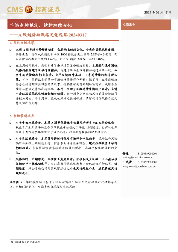 【海通证券】【20240317】A股趋势与风格定量观察:市场走势稳定,结构继续分化-10页