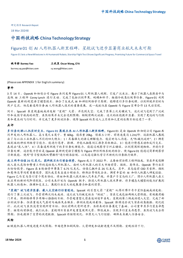 【海通国际】【20240318】中国科技行业战略:Figure+01创AI人形机器人新里程碑,星舰试飞进步显著商业航天未来可期-12页