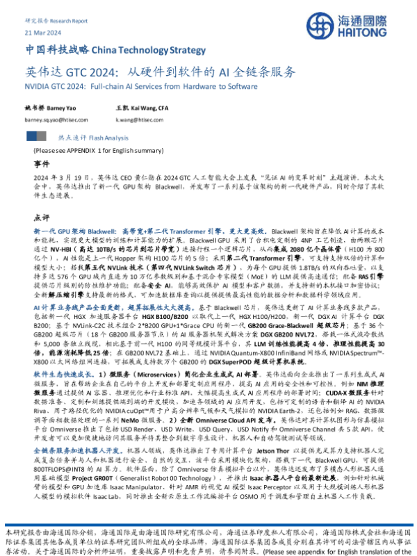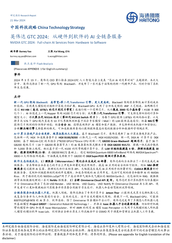 【海通国际】【20240321】中国科技行业战略:英伟达GTC 2024,从硬件到软件的AI全链条服务-13页