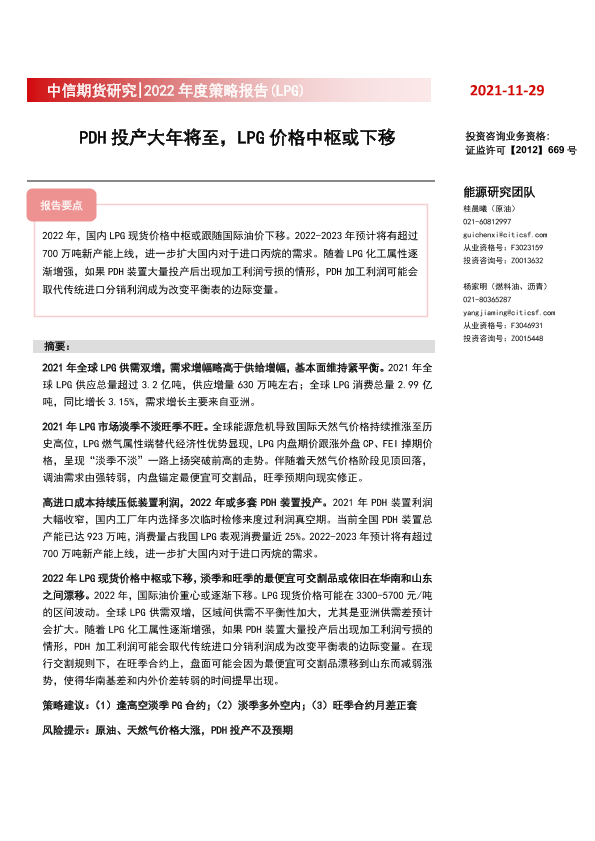 【中信期货】【20211129】2022年度策略报告(LPG) :PDH投产大年将至,LPG价格中枢或下移-17页