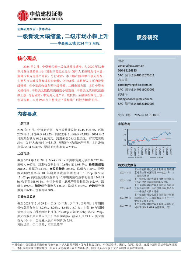 【中信建投证券】【20240318】中资美元债2024年2月报:一级新发大幅缩量,二级市场小幅上升-11页