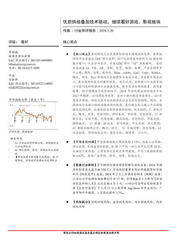【首创证券】【20240320】传媒行业简评报告:优质供给叠加技术驱动,继续看好游戏、影视板块-14页