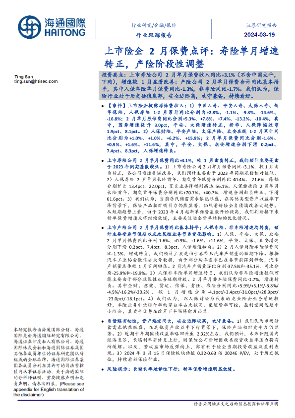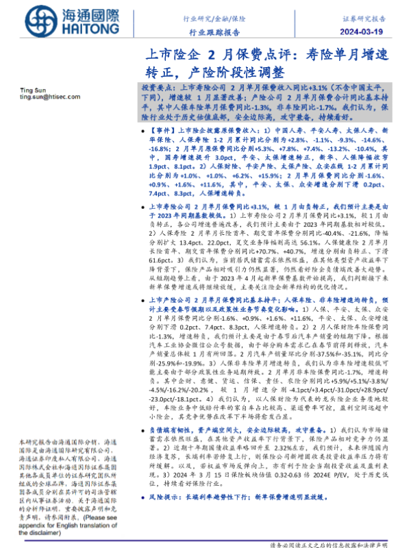 【海通国际】【20240317】保险行业上市险企2月保费点评:寿险单月增速转正,产险阶段性调整-15页