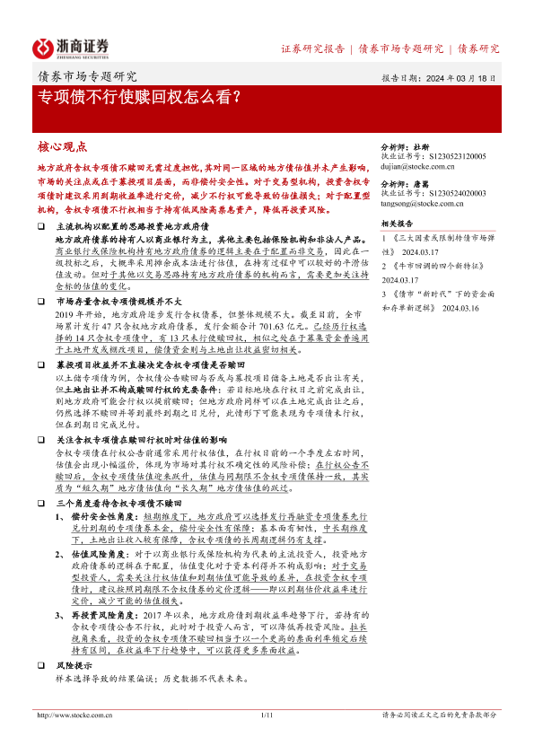 【浙商证券】【20240318】债券市场专题研究:专项债不行使赎回权怎么看?-9页