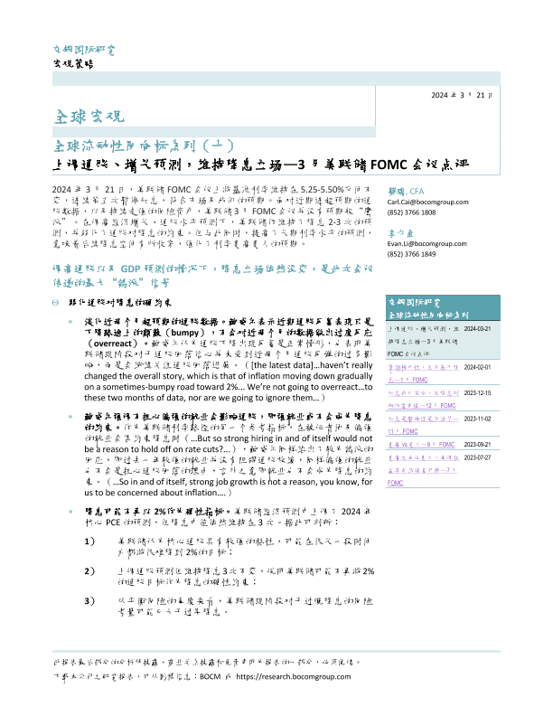 【交银国际】【20240321】全球流动性风向标系列(十),3月美联储FOMC会议点评:上调通胀、增长预测,维持降息立场-10页