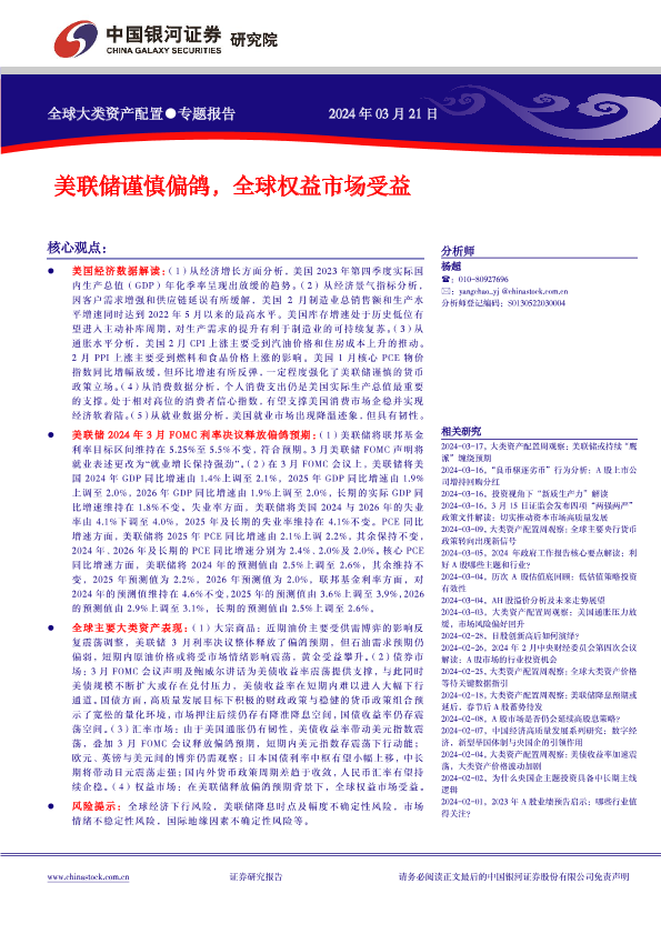 【银河证券】【20240321】全球大类资产配置专题报告:美联储谨慎偏鸽,全球权益市场受益-13页