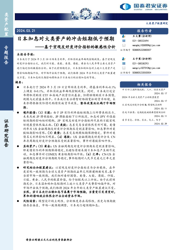 【国泰君安证券】【20240321】基于宏观友好度评分指标的敏感性分析:日本加息对大类资产的冲击短期低于预期-18页
