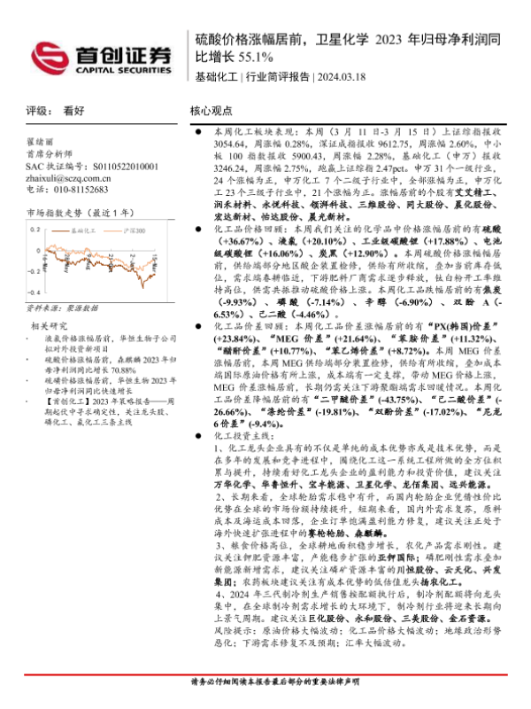 【首创证券】【20240318】基础化工行业简评报告:硫酸价格涨幅居前,卫星化学2023年归母净利润同比增长55.1%-14页