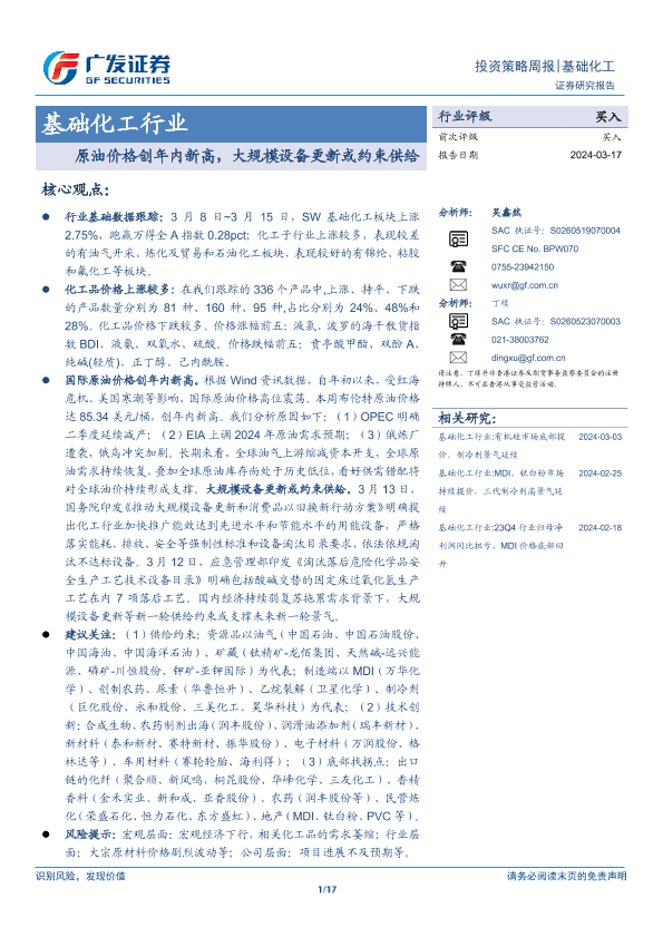 【广发证券】【20240317】基础化工行业:原油价格创年内新高,大规模设备更新或约束供给-15页