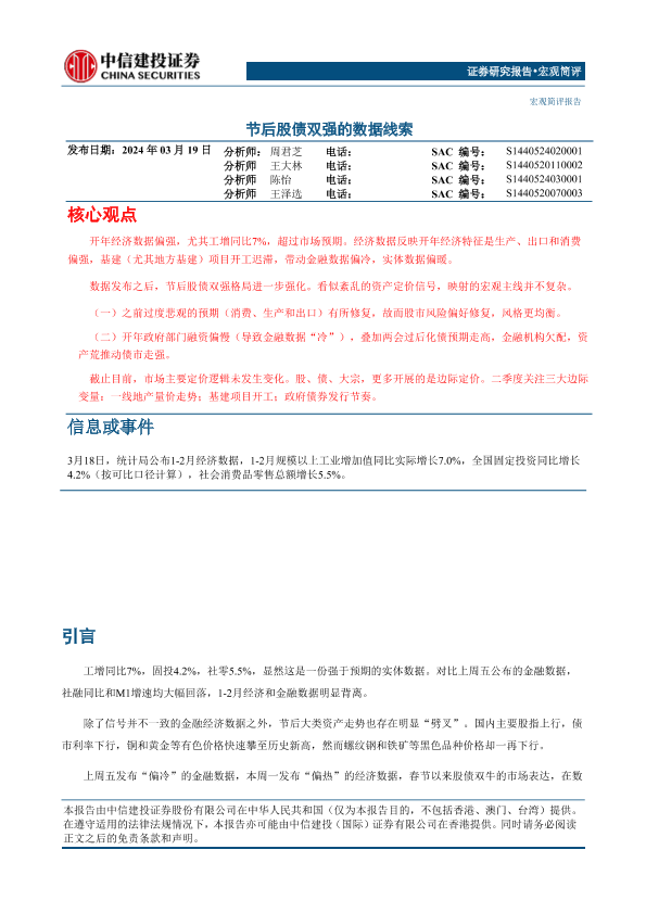 【中信建投证券】【20240319】宏观简评:节后股债双强的数据线索-11页