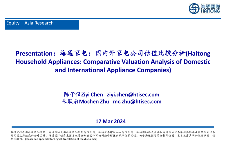 【海通国际】【20240317】家电行业:国内外家电公司估值比较分析-34页