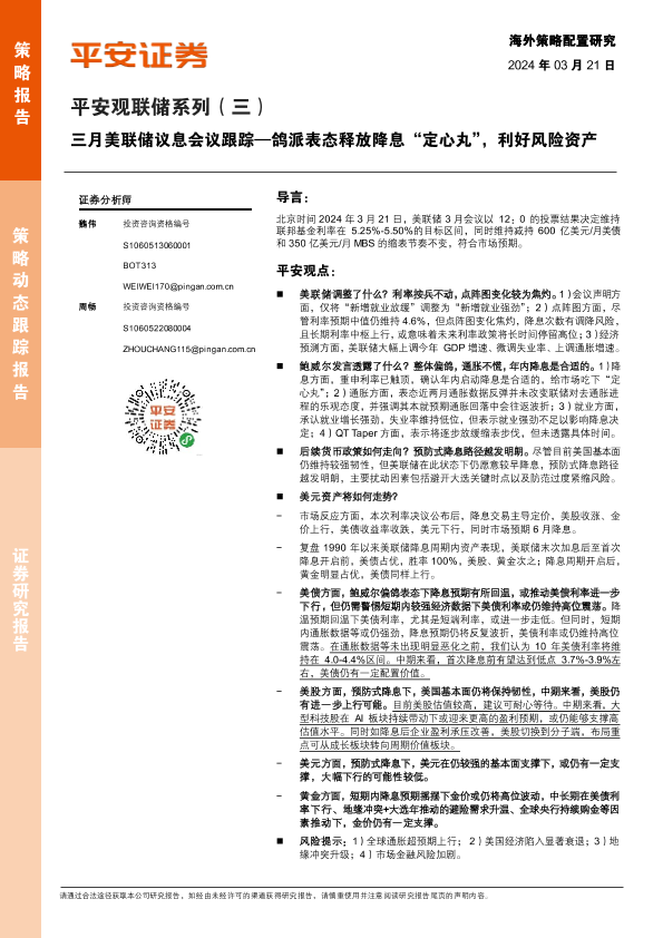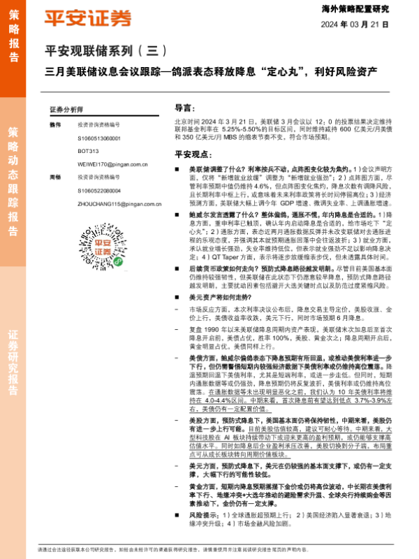 【平安证券】【20240321】平安观联储系列(三)-三月美联储议息会议跟踪:鸽派表态释放降息“定心丸”,利好风险资产-10页