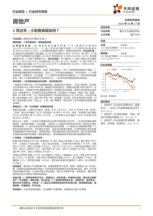 【天风证券】【20240317】房地产行业报告:3月过半,小阳春表现如何?-18页