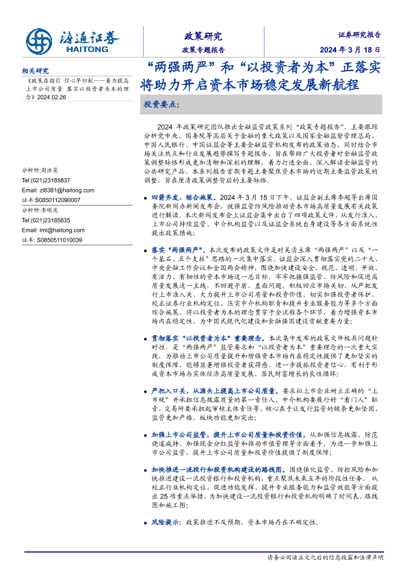 【海通证券】【20240318】政策研究:“两强两严”和“以投资者为本”正落实将助力开启资本市场稳定发展新航程-11页