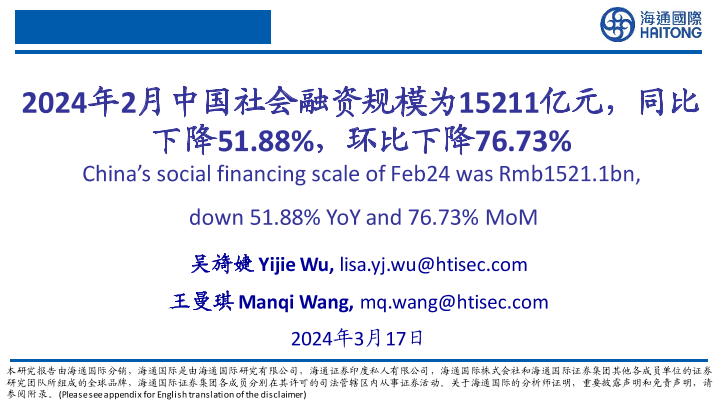 【海通国际】【20240317】有色金属行业:2024年2月中国社会融资规模为15211亿元,同比下降51.88%,环比下降76.73%-25页