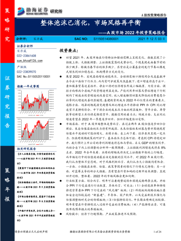 【渤海证券】【20211203】A股市场2022年投资策略报告:整体泡沫已消化,市场风格再平衡-26页