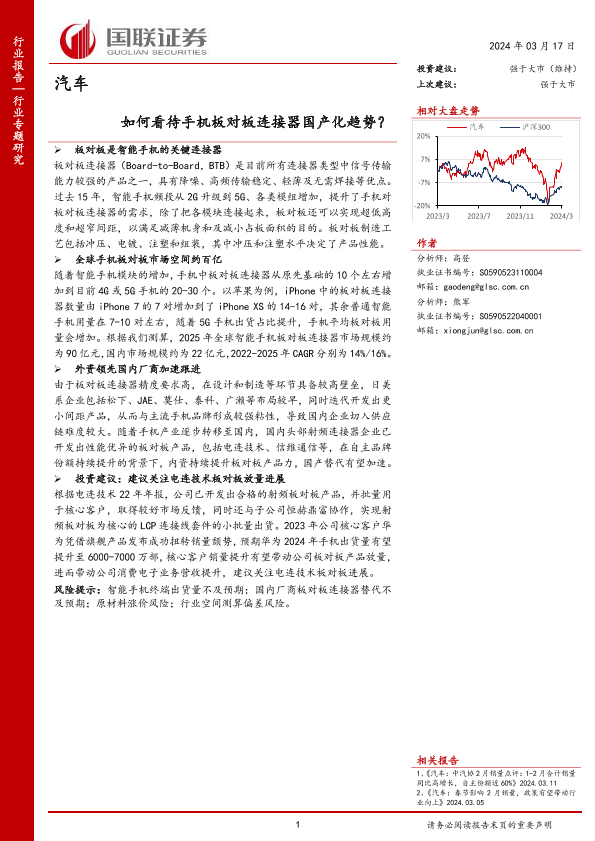 【国联证券】【20240317】汽车行业专题研究:如何看待手机板对板连接器国产化趋势?-10页