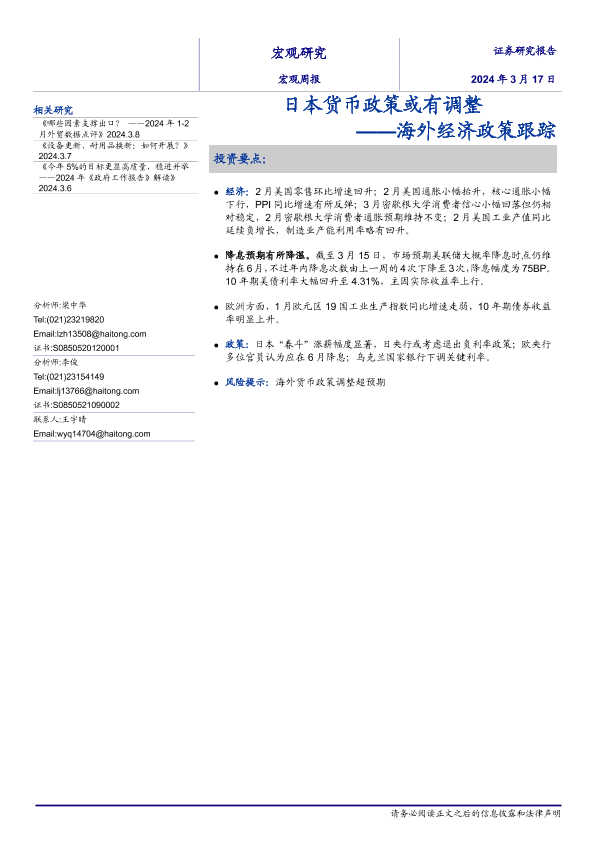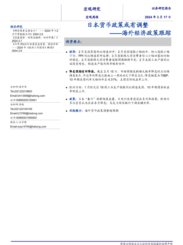 【海通证券】【20240317】海外经济政策跟踪:日本货币政策或有调整-10页