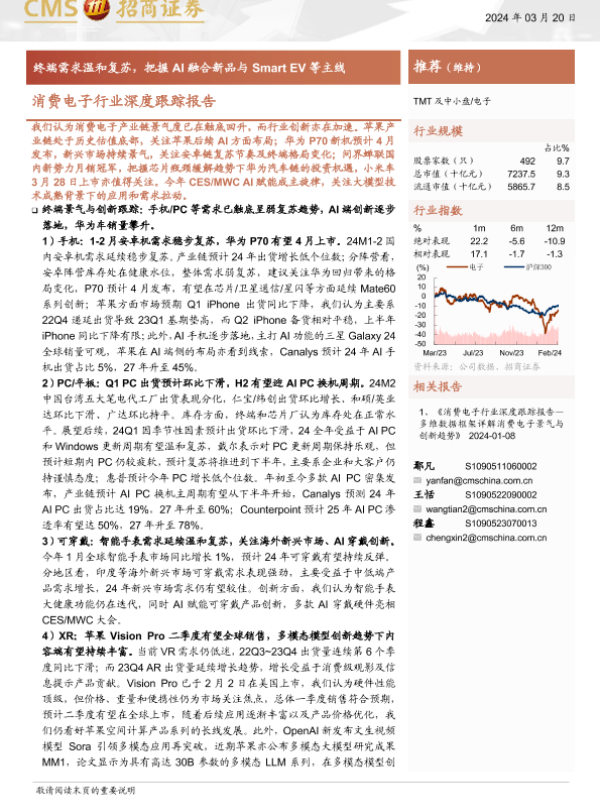 【海通证券】【20240320】消费电子行业深度跟踪报告:终端需求温和复苏,把握AI融合新品与SmartEV等主线-83页