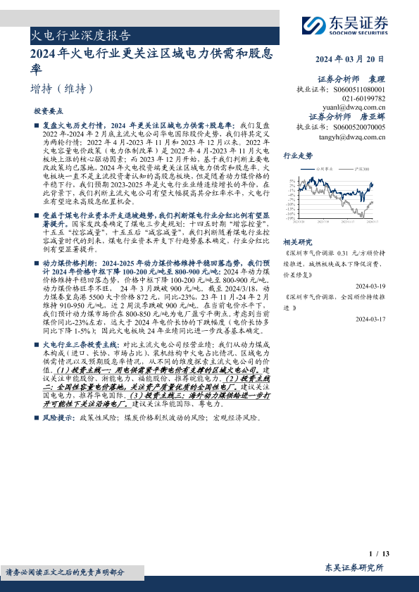 【东吴证券】【20240320】火电行业深度报告:2024年火电行业更关注区域电力供需和股息率-13页