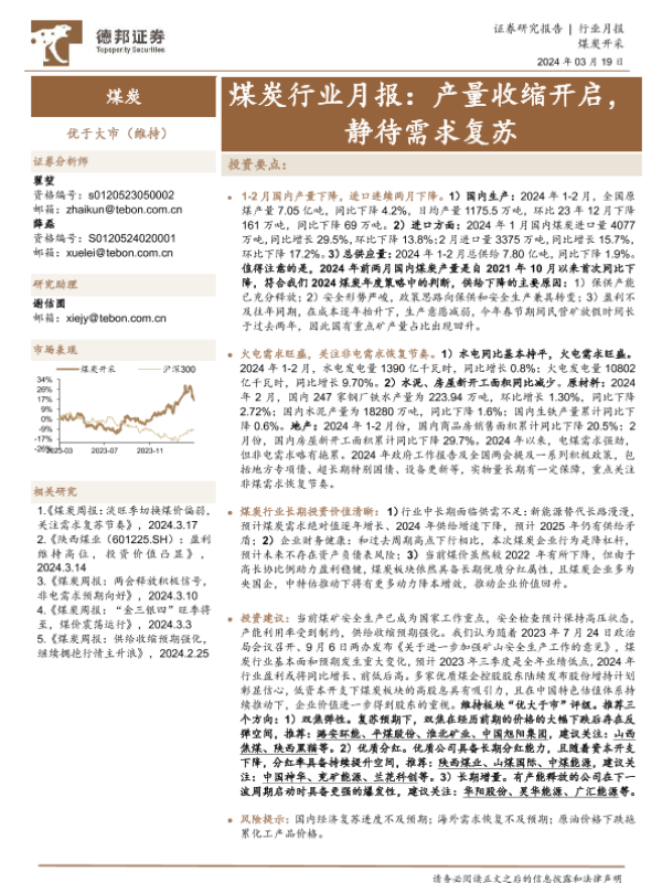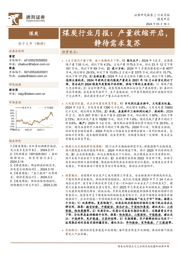 【德邦证券】【20240319】煤炭行业月报:产量收缩开启,静待需求复苏-10页