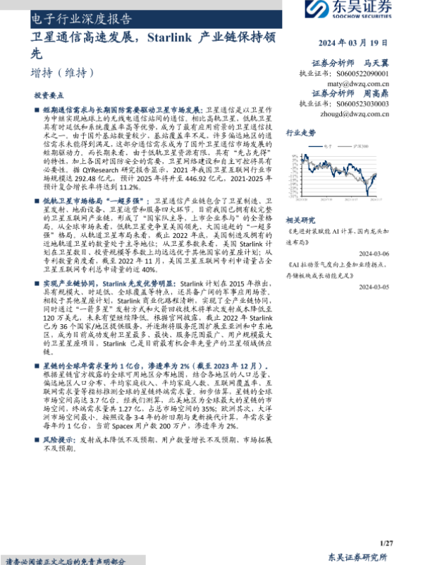 【东吴证券】【20240319】电子行业深度报告:卫星通信高速发展,Starlink产业链保持领先-27页