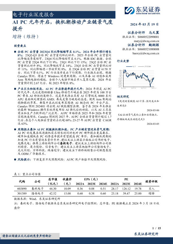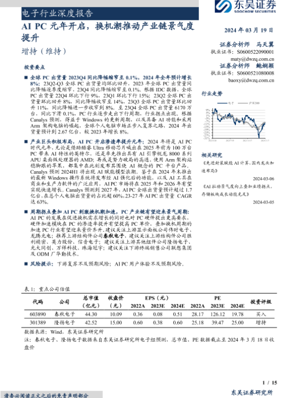 【东吴证券】【20240319】电子行业深度报告:AI+PC元年开启,换机潮推动产业链景气度提升-15页