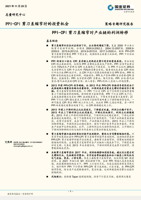 【国金证券】【20211129】PPI-CPI剪刀差缩窄时的投资机会:PPI-CPI剪刀差缩窄时产业链的利润转移-24页